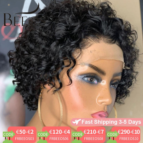 Beeos 250% Pixie Cut Short Curly Wig 4*4 Closure Lace Human Hair Wigs Brazilian Remy 8"Inch Human Hair PrePlucked With Baby Hair