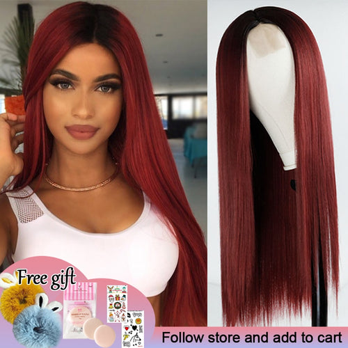 Long Straight Hair Wig Wine Red Synthetic Wig Ladies Natural Hand Middle Heat-resistant Fiber Daily Wig