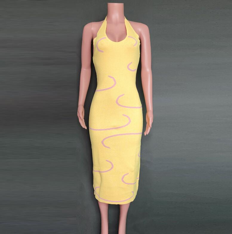 Knitted Bodycon Dress Women Y2K Halter Neck Summer Yellow Sleeveless Midi Backless Party Sexy Dresses