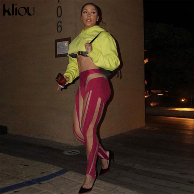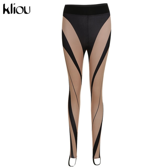 Kliou Striped Hipster Leggings Women Summer Medium Waist Patchwork Trousers Body-shaping Active Party Streetwear Skinny Pants