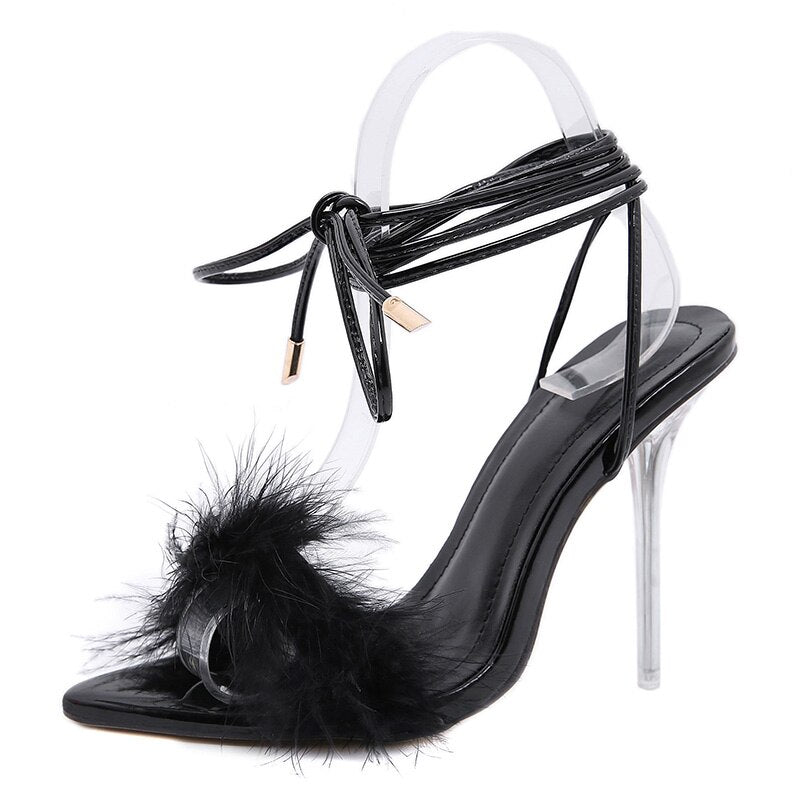 summer shoes woman pointed toe snake print high heels sexy feather women sandals ankle cross strap transparent clear heel