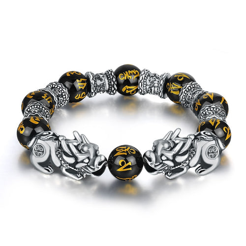 Feng Shui Obsidian Beads Bracelet Silver Color Pixiu Unicorn Charm Lucky Wealth Bracelet for Women Trendy Jewelry Word Proverbs