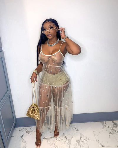 ANJAMANOR Glitter Star Sequin Black Mesh Sexy Maxi Dresses for Women Clothing Summer Sundresses Party Club Outfits D89-CD23