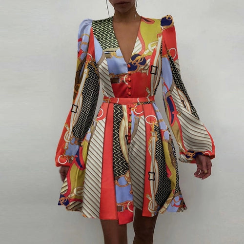 2021 Spring Floral Print Satin Party Dress Women Deep V-neck Button Mini Dress Autumn Elegant Puff Shoulder A-Line Dresses Belt