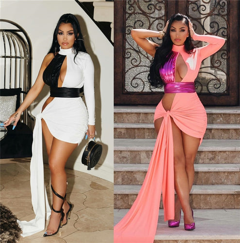 Adogirl Women Sexy Color Patchwork Lace Up Mini Summer Dress Hollow Out Halter One Shoulder Long Sleeve Bodycon Club Party Wear