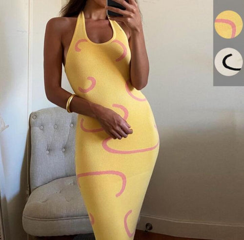 Knitted Bodycon Dress Women Y2K Halter Neck Summer Yellow Sleeveless Midi Backless Party Sexy Dresses
