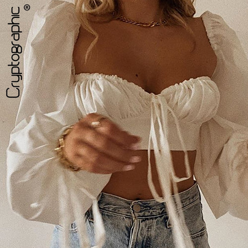 Cryptographic White Balloon Sleeve Elegant Women Top and Blouse Shirts Autumn 2021 Sexy Backless Crop Tops Solid Fashion Blusas